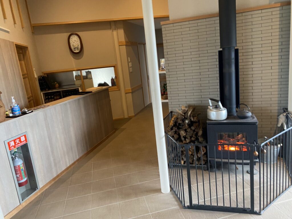 建物の入口を入るともう3月なのに受付の横で大きな薪ストーブが焚かれてます・・